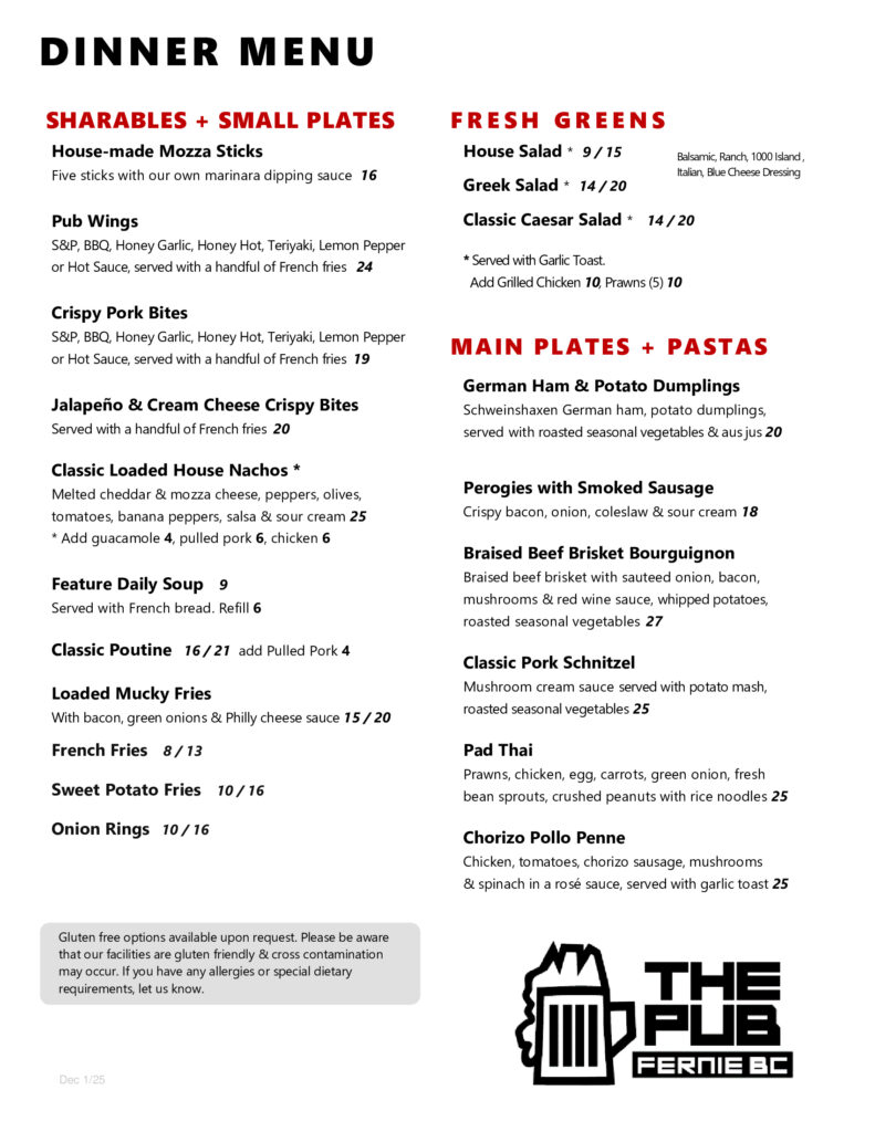 Join for a delicious meal & great time in the Pub at Park Place Lodge in Fernie, BC!