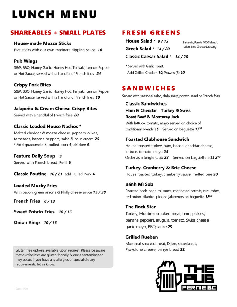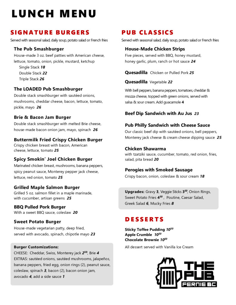 Guests looking for a casual but unique restaurant and dining option in Fernie will enjoy the varied and extensive pub-style menu offered daily for lunch and dinner.