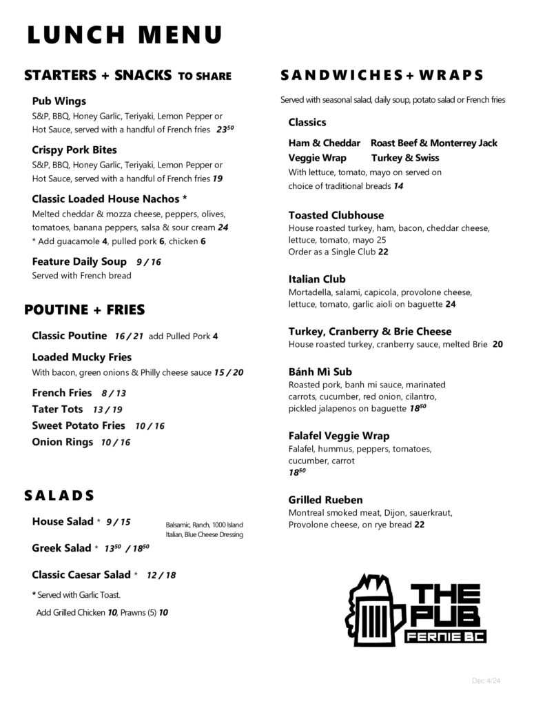 The Pub Bar & Grill is also home to weekend brunch, the best wing night special in town every Tuesday, Trivia Night Thursdays (Fall & Winter), Fish n’ Chips every Friday, Sunday Summer Socials plus Ghostrider Hockey Night in Fernie on Home Game Nights!