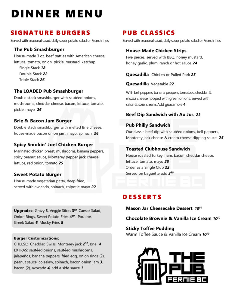 After a big day of skiing, mountain biking or fly-fishing, the Pub Bar & Grill at Park Place Lodge is Fernie’s favourite gathering spot to share a few good laughs over beer & a burger. Located in the Park Place Lodge, the Pub features an extensive lunch and dinner menu of Canadian inspired pub classics as well as a delicious brunch menu every Friday, Saturday and Sunday from 10 AM. Enjoy a full selection of premium ales on tap including tasty local brews from Fernie Brewing Co. Watch all the top sporting events on our large screen HD TV’s, enjoy free WiFi internet access or play a game of pool. In summertime, enjoy the sun and great mountain views on our outdoor patio or you can also stay cool with air-conditioning inside. Reasonable prices and a large selection of refreshments (including 16 beers on tap!) served by some of the best staff Fernie has to offer, makes the Pub feel like your own neighborhood pub.